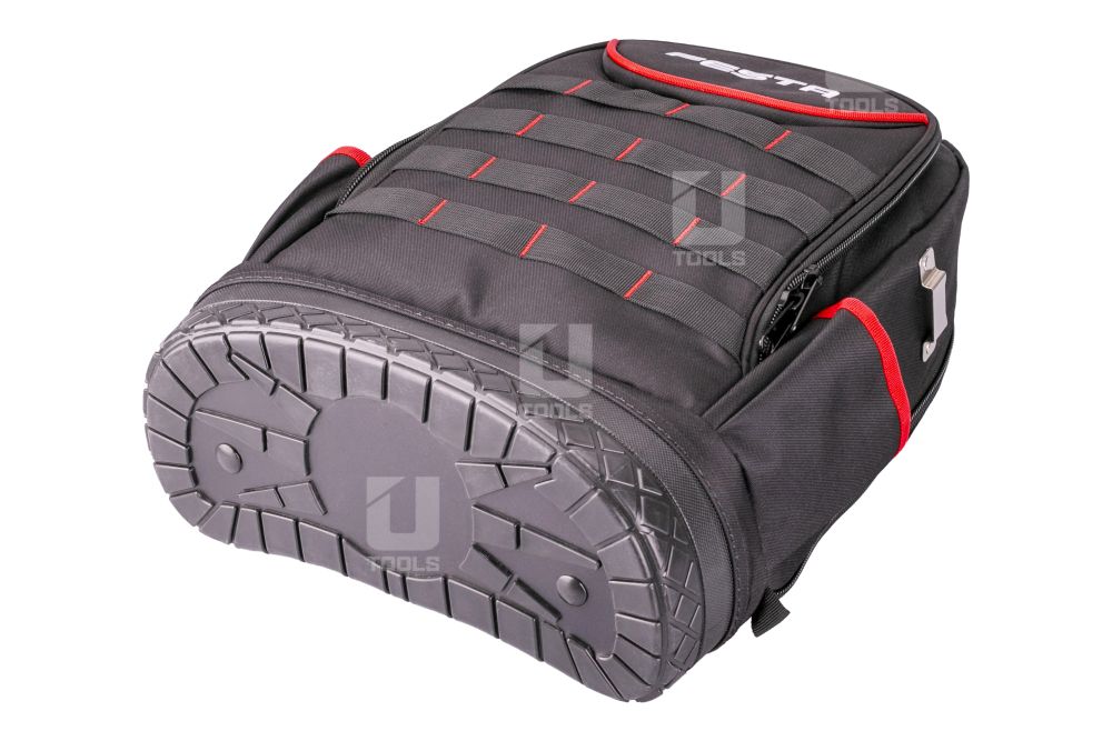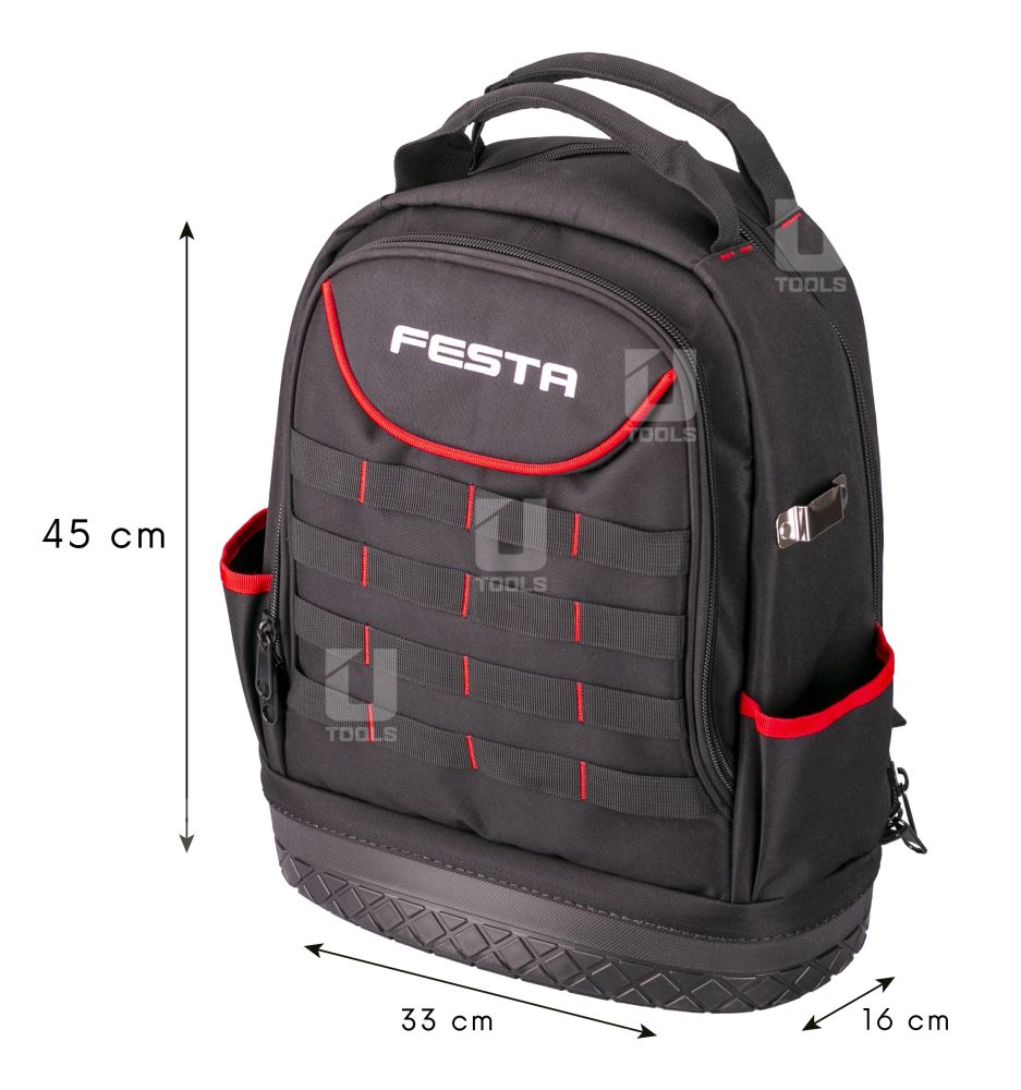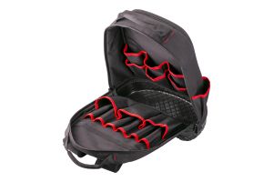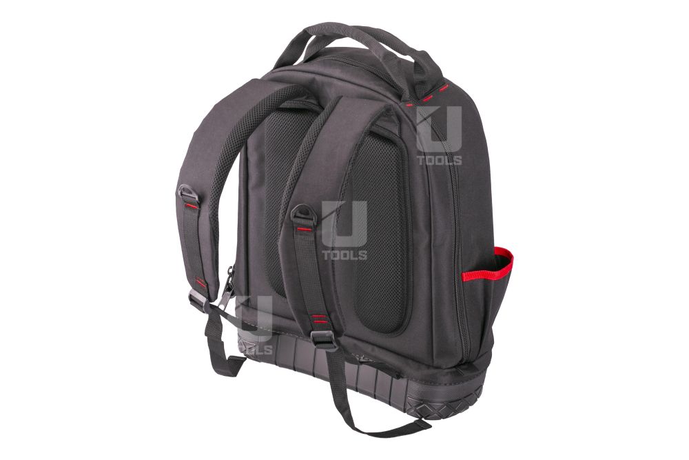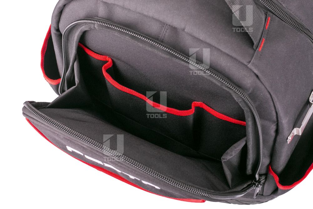 Batoh ponúka 18 vnútorných a 2 vonkajšie vrecká pre prehľadné uloženie náradia. Súčasťou je aj kovová spona na zvinovací meter a systém MOLLE/PALS na prednej strane, ktorý umožňuje upevnenie ďalšieho náradia alebo ochranných pomôcok. Batoh má rozmery 45 × 33 × 16 cm a objem 20 l, čo poskytuje dostatok priestoru pre usporiadané uloženie náradia a príslušenstva pri zachovaní kompaktných rozmerov pre pohodlné prenášanie.