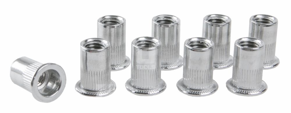 - Hliníková nýtovacia matica s metrickým závitom M6, dĺžka 14 mm, počet v balení 20 ks, zúbkovaný golier pre väčšiu pevnosť spoja.